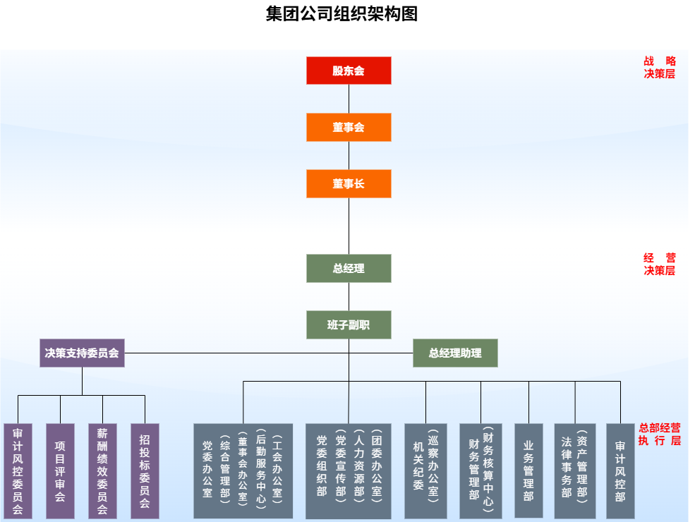 股东会是公司的最高权力机构,下设董事会和监事会。公司组织管理实行董事会领导下的总经理负责制。根据公司发展需要,公司管理层下设审计风控委员会、薪酬绩效委员会、招投标委员会和项目评审会四个决策支持委员会和党委办公室(综合管理部 | 董事会办公室 | 后勤服务中心 | 工会办公室)、党委组织部(党委宣传部 | 人力资源部 | 团委办公室)、机关纪委(巡察办公室)、财务管理部(财务核算中心)、业务管理部、审计风控部、法律事务部(资产管理部)个七个职能部门。