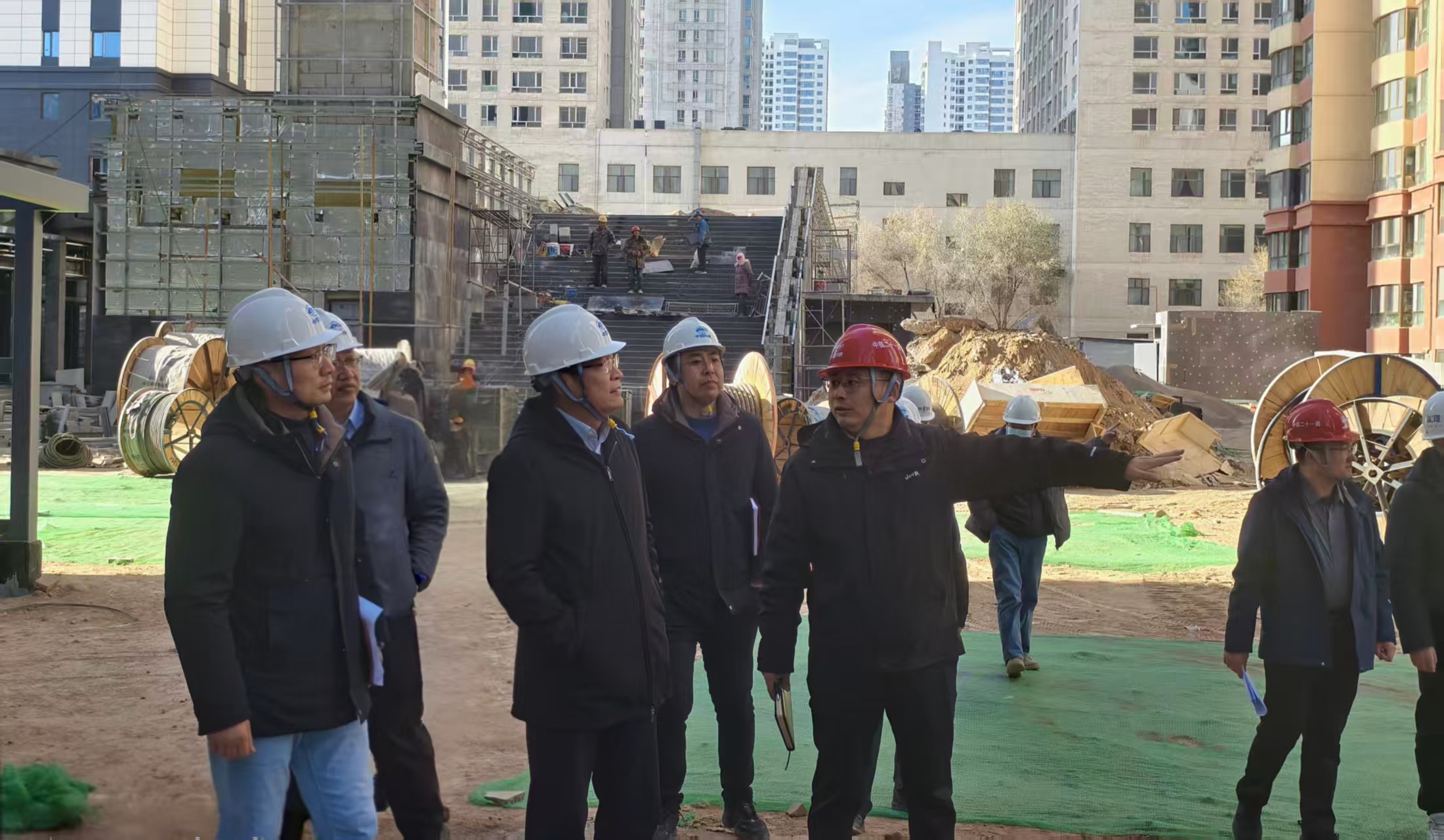 2025年12月5日,集团公司党委副书记、总经理林博,党委副书记、工会主席汪寿荣,党委委员、副总经理杜臣帮一行,在资产公司相关人员陪同下,赴“茂祥项目”现场开展调研指导工作。调研组一行深入“茂祥项目”二期施工现场,详细查看了主体施工、管网改造、园林绿化等关键作业面,仔细询问现场施工人员落实施工工艺、材料品质及安全生产措施情况,对冬季严寒条件下施工管理、技术标准进行了现场指导。在项目营销中心,调研组听取了茂祥负责人关于项目施工安全和进度,当前销售去化、市场反馈及剩余拆迁工作进展的情况汇报,对项目全周期开发运营情况进行了深入了解。